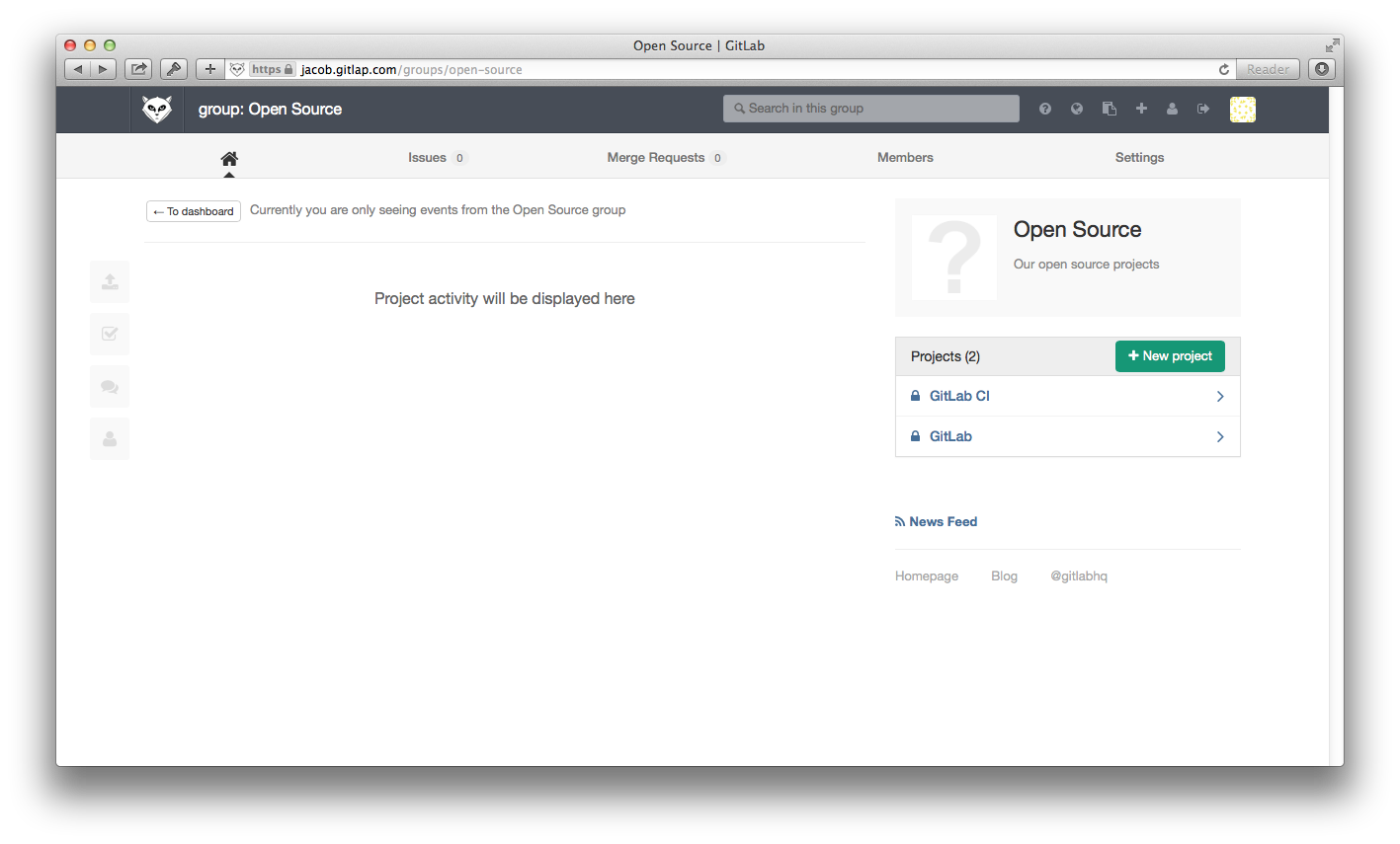 When your group has been created you are presented with the group dashboard feed, which will be empty.